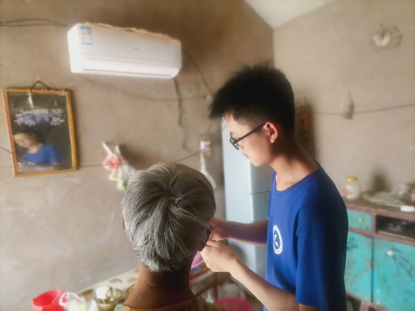 (志愿者到老人家中进行一对一智能家用空调遥控器功能的讲解)