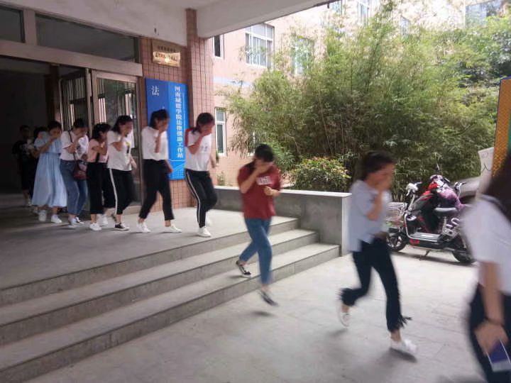 随着一阵尖锐而又急促的火警警报声响起,同学们立即紧急进入警备状态。迅速排好队,从教室和宿舍楼往楼梯口撤退。他们紧贴着墙壁或楼梯栏杆,右手捂住口鼻,弯腰、有序、安全地向前小跑。此时,楼梯口烟雾弹燃放滚滚呛人的浓烟,学生们毫不慌乱,工作人员恪尽职守,在两分钟之内按预定的疏散路线,安全撤离到指定地点。